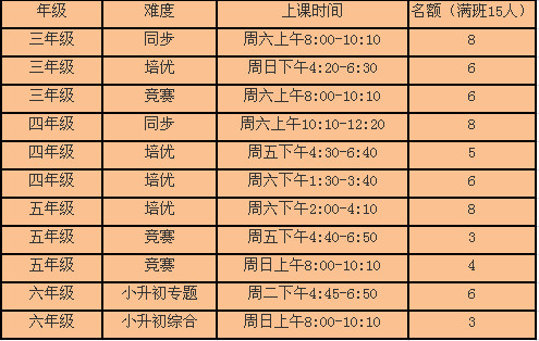 河北师范大学培训中心红旗校区高斯数学各年级上课时间表如下: